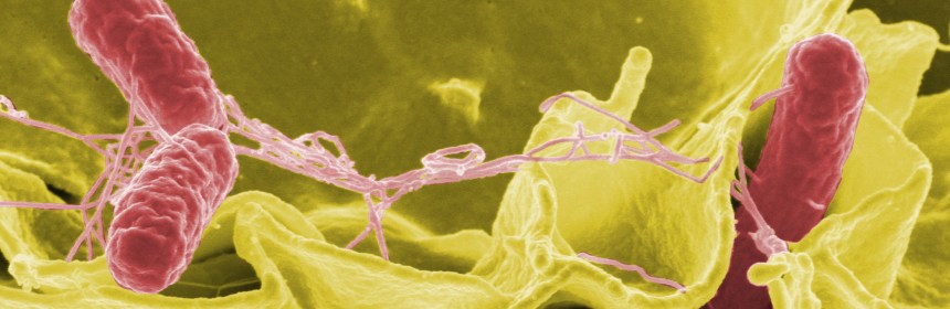 Image: Color-enhanced scanning electron micrograph showing Salmonella typhimurium (red) invading cultured human cells. (Source: Wikimedia Commons)